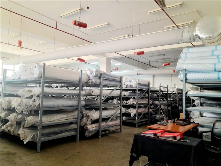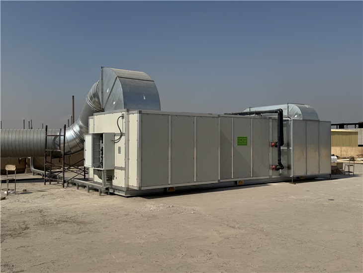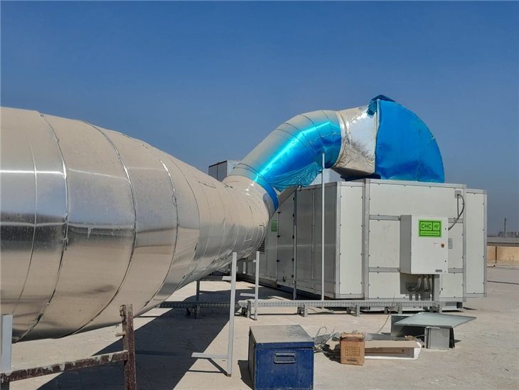 un’Unità Trattamento Aria CHC con portata d’aria di 65000 mc/h costruita appositamente, con pannellature studiate per evitare infiltrazioni di polvere e sabbia, peculiari della zona desertica ove è installata e doppio sistema di filtrazione per i pelucchi prodotti dalla lavorazione dei tessuti