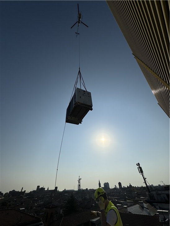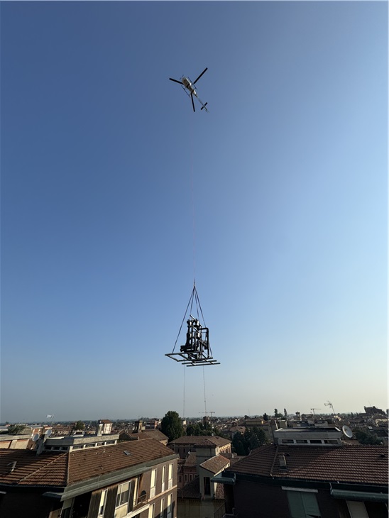 Gli spazi cittadini non permettevano, inoltre, di posizionare una gru delle dimensioni necessarie a raggiungere la copertura del condominio, pertanto il posizionamento è avvenuto mediante l'utilizzo di un elicottero.
